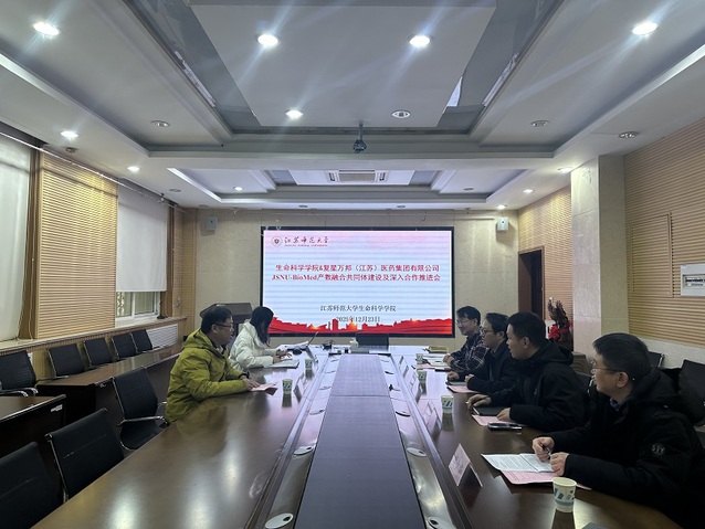 12月23日,复星万邦(江苏)医药集团有限公司高级副总裁李博一行来我院考察交流,双方围绕“JSNU-BioMed”产教融合共同体建设深入探讨,公司相关负责同志和学院部分教师代表参加研讨,田俊院长主持会议。